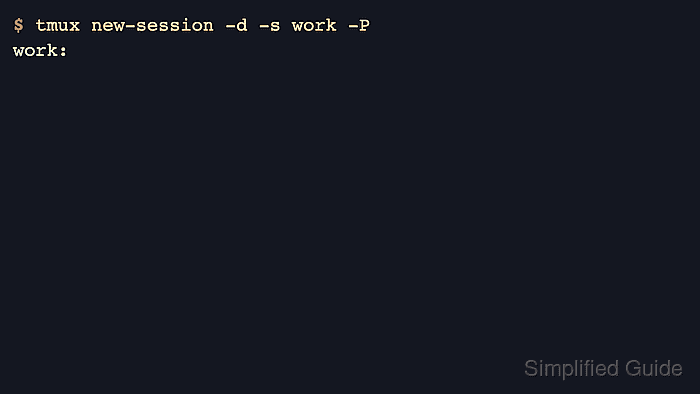 Printing the new session with -P gives immediate confirmation that the server accepted the create request, and list-sessions provides a second check that the session now exists. If the chosen name is already in use, tmux rejects the request so you do not accidentally replace another running session.