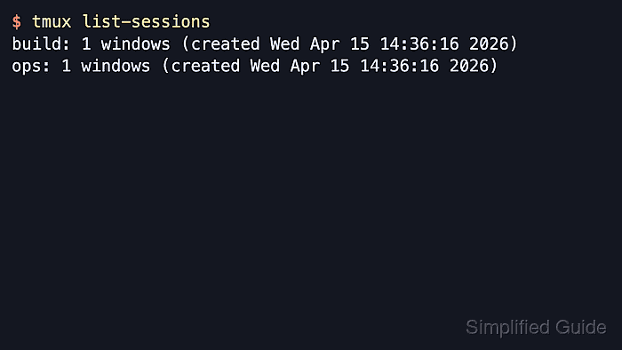$ tmux list-sessions build: 1 windows (created Wed Apr 15 14:36:16 2026) ops: 1 windows (created Wed Apr 15 14:36:16 2026)