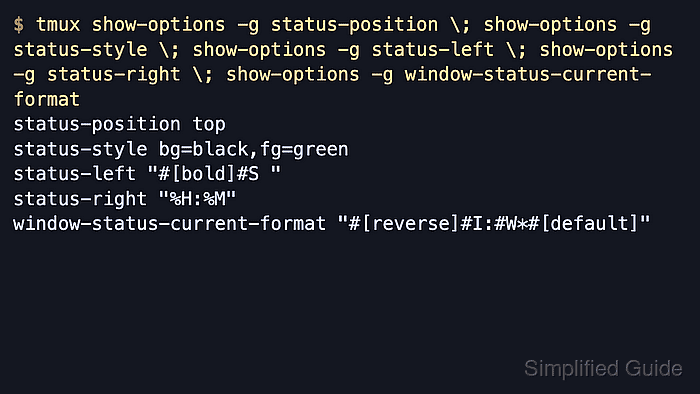 $ tmux show-options -g status-position \; show-options -g status-style \; show-options -g status-left \; show-options -g status-right \; show-options -g window-status-current-format status-position top status-style bg=black,fg=green status-left "#[bold]#S " status-right "%H:%M" window-status-current-format "#[reverse]#I:#W*#[default]"