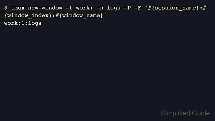 $ tmux new-window -t work: -n logs -P -F '#{session_name}:#{window_index}:#{window_name}' work:1:logsThe -t work: target tells tmux which session receives the new window, and omitting a window number lets tmux use the next unused index.