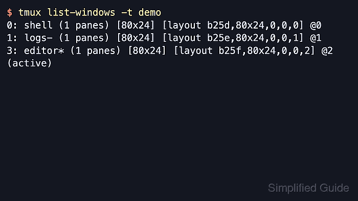 $ tmux list-windows -t demo 0: shell (1 panes) [80x24] [layout b25d,80x24,0,0,0] @0 1: logs- (1 panes) [80x24] [layout b25e,80x24,0,0,1] @1 3: editor* (1 panes) [80x24] [layout b25f,80x24,0,0,2] @2 (active)