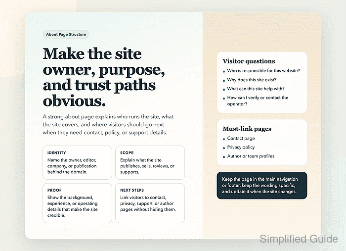 An about page gives visitors the missing context that most homepages, product pages, and articles leave out. It answers who operates the site, what the site is actually for, and why a reader should treat the business, publication, or individual behind it as real and accountable.