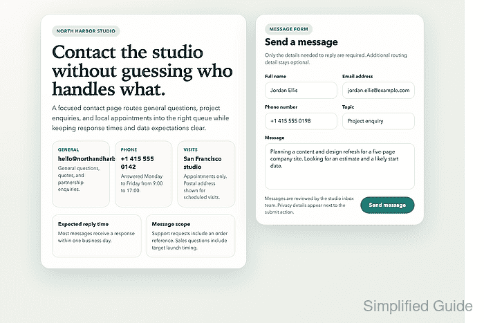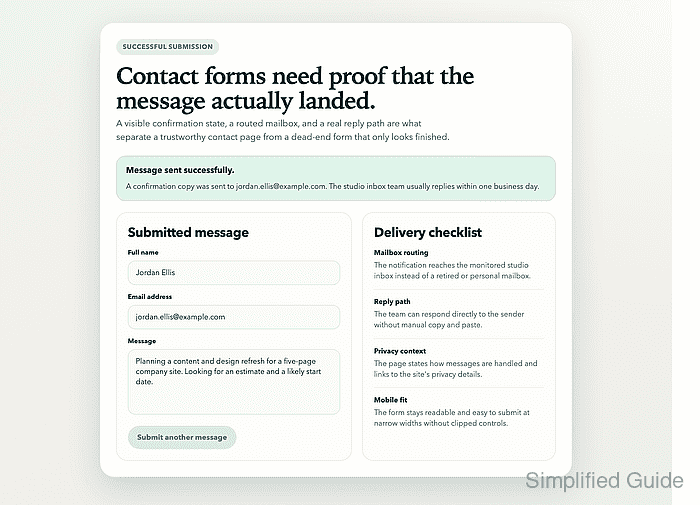 The page should ask only for the information needed to respond, explain when replies usually arrive, and stay aligned with the site's privacy expectations. When a web form is used, visible labels, appropriate field types such as email and tel, and matching autocomplete values help browsers present better validation and autofill behavior, but the real success check is still an end-to-end submission that lands in the correct inbox.