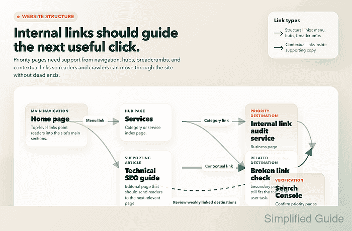Internal links help visitors and search engines move from broad navigation pages to the pages that actually matter, such as service pages, product pages, category pages, and contact or conversion pages. A clear internal-link structure reduces buried content, shortens the path to important pages, and gives supporting pages a defined job instead of leaving them isolated.