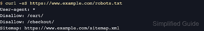 $ curl -sS https://www.example.com/robots.txt User-agent: * Disallow: /cart/ Disallow: /checkout/ Sitemap: https://www.example.com/sitemap.xml