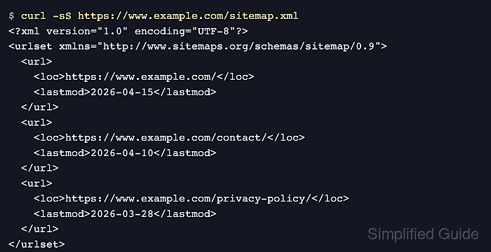 $ curl -sS https://www.example.com/sitemap.xml <?xml version="1.0" encoding="UTF-8"?> <urlset xmlns="http://www.sitemaps.org/schemas/sitemap/0.9"> <url> <loc>https://www.example.com/</loc> <lastmod>2026-04-15</lastmod> </url> ##### snipped #####A direct fetch should return the sitemap itself rather than an HTML page, a redirect chain, a login prompt, or a 404 response.