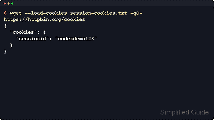 $ wget --load-cookies session-cookies.txt -qO- https://httpbin.org/cookies { "cookies": { "sessionid": "codexdemo123" } }Use a protected page, account dashboard, or echo endpoint that exposes the session state so a redirected login page is not mistaken for success.
