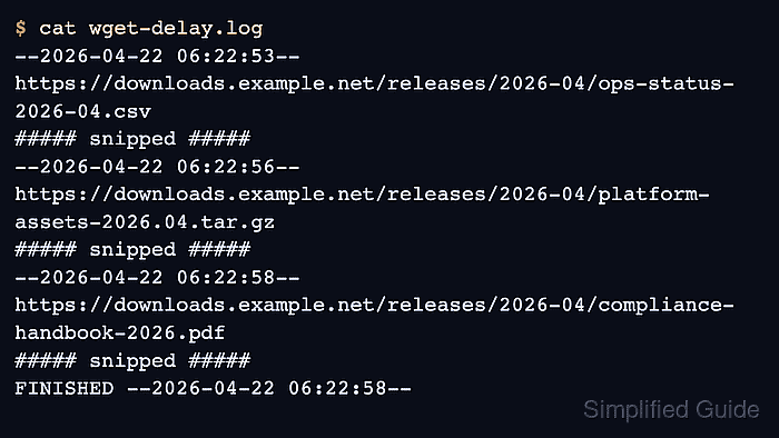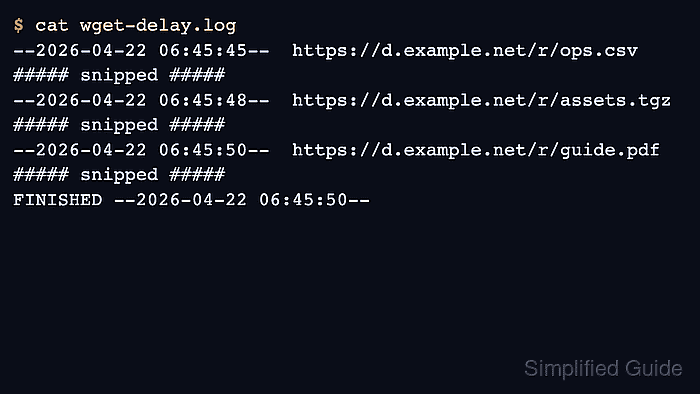 $ cat wget-delay.log --2026-04-22 06:45:45-- https://d.example.net/r/ops.csv ##### snipped ##### --2026-04-22 06:45:48-- https://d.example.net/r/assets.tgz ##### snipped ##### --2026-04-22 06:45:50-- https://d.example.net/r/guide.pdf ##### snipped ##### FINISHED --2026-04-22 06:45:50--