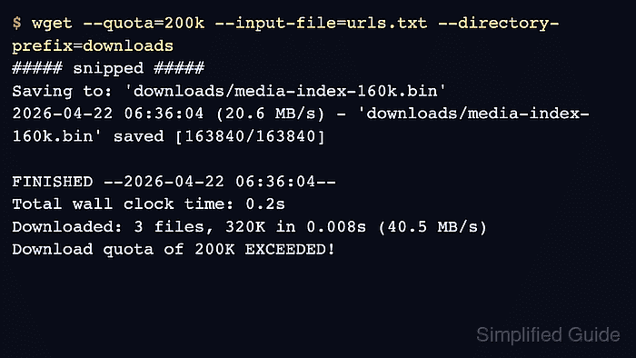 $ wget --quota=200k --input-file=urls.txt --directory-prefix=downloads ##### snipped ##### Saving to: 'downloads/catalog-064k.bin' 2026-04-22 06:36:04 (2.77 GB/s) - 'downloads/catalog-064k.bin' saved [65536/65536] ##### snipped ##### Saving to: 'downloads/inventory-delta-096k.bin' 2026-04-22 06:36:04 (876 MB/s) - 'downloads/inventory-delta-096k.bin' saved [98304/98304] ##### snipped ##### Saving to: 'downloads/media-index-160k.bin' 2026-04-22 06:36:04 (20.6 MB/s) - 'downloads/media-index-160k.bin' saved [163840/163840] FINISHED --2026-04-22 06:36:04-- Total wall clock time: 0.2s Downloaded: 3 files, 320K in 0.008s (40.5 MB/s) Download quota of 200K EXCEEDED!