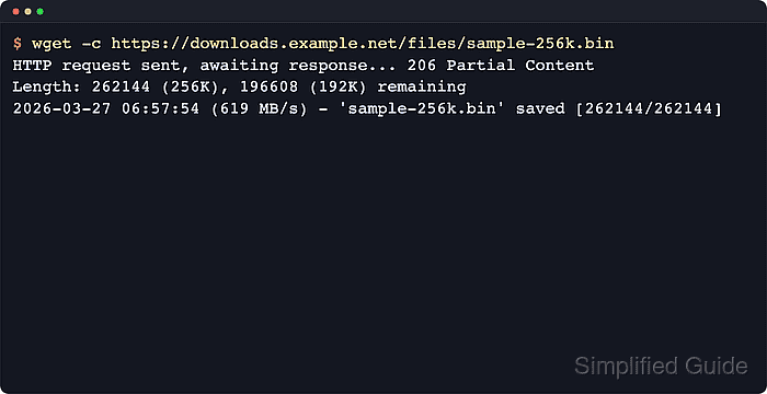$ wget -c https://downloads.example.net/files/sample-256k.bin --2026-03-27 06:57:54-- https://downloads.example.net/files/sample-256k.bin Connecting to downloads.example.net (downloads.example.net)|203.0.113.50|:443... connected. HTTP request sent, awaiting response... 206 Partial Content Length: 262144 (256K), 196608 (192K) remaining [application/octet-stream] Saving to: 'sample-256k.bin' [ skipping 50K ] 50K ,,,,,,,,,, ,,,,...... .......... .......... .......... 39% 561M 0s ... 2026-03-27 06:57:54 (619 MB/s) - 'sample-256k.bin' saved [262144/262144]A 206 Partial Content response confirms that the server accepted the range request and only sent the missing bytes.