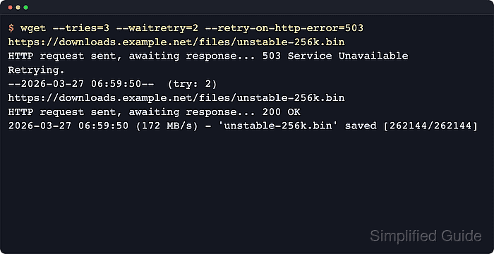 $ wget --tries=3 --waitretry=2 --retry-on-host-error --retry-on-http-error=503 https://downloads.example.net/files/unstable-256k.bin --2026-03-27 06:59:49-- https://downloads.example.net/files/unstable-256k.bin Connecting to downloads.example.net (downloads.example.net)|203.0.113.50|:443... connected. HTTP request sent, awaiting response... 503 Service Unavailable Retrying. --2026-03-27 06:59:50-- (try: 2) https://downloads.example.net/files/unstable-256k.bin Connecting to downloads.example.net (downloads.example.net)|203.0.113.50|:443... connected. HTTP request sent, awaiting response... 200 OK Length: 262144 (256K) [application/octet-stream] Saving to: 'unstable-256k.bin' ... 2026-03-27 06:59:50 (172 MB/s) - 'unstable-256k.bin' saved [262144/262144]