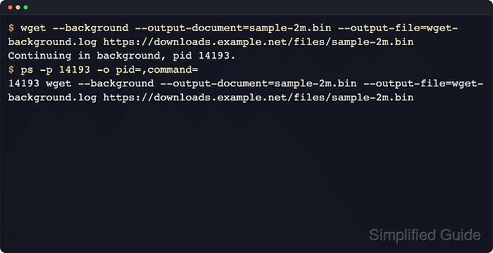 $ ps -p 14193 -o pid=,command= 14193 wget --background --continue --output-document=sample-2m.bin --output-file=wget-background.log https://downloads.example.net/files/sample-2m.bin