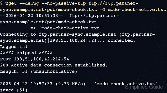 $ wget --debug --no-passive-ftp ftp://ftp.partner-sync.example.net/pub/mode-check.txt -O ftp-mode-verify.txt ##### snipped ##### ==> PORT ... --> PORT 198,51,100,42,214,54 200 Active data connection established. ##### snipped ##### 2026-04-22 10:57:33 (9.73 MB/s) - 'ftp-mode-verify.txt' saved [51]