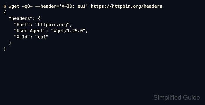$ wget -qO- --header='X-ID: eu1' \ https://httpbin.org/headers { "headers": { "Host": "httpbin.org", "User-Agent": "Wget/1.25.0", "X-Id": "eu1" } }Each --header option must contain the full header line, including the field name, the colon, and the value.