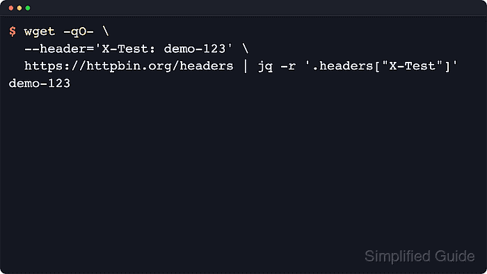 $ wget -qO- \ --header='X-Test: demo-123' \ https://httpbin.org/headers | jq -r '.headers["X-Test"]' demo-123