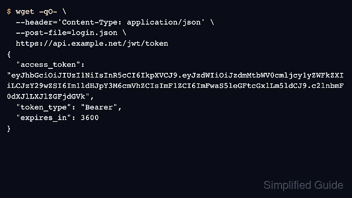 Many API login and client-credential endpoints accept a JSON request body and return a JSON Web Token JWT for later requests. In wget, that keeps the token request and the protected API call in the same shell workflow.