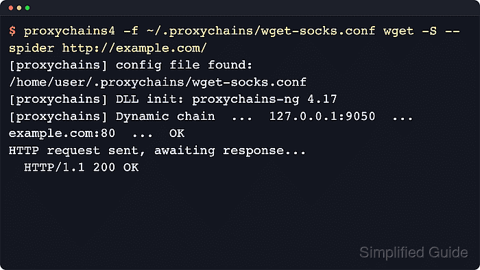 $ proxychains4 -f ~/.proxychains/wget-socks.conf wget -S --spider http://example.com/ [proxychains] config file found: /home/user/.proxychains/wget-socks.conf [proxychains] DLL init: proxychains-ng 4.17 Connecting to example.com (example.com)|224.0.0.1|:80... [proxychains] Dynamic chain ... 127.0.0.1:9050 ... example.com:80 ... OK connected. HTTP request sent, awaiting response... HTTP/1.1 200 OK