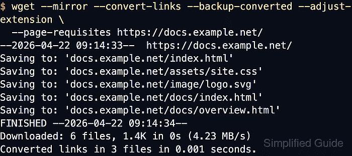 $ wget --mirror --convert-links --backup-converted --adjust-extension --page-requisites https://docs.example.net/ --2026-04-22 09:14:33-- https://docs.example.net/ Resolving docs.example.net (docs.example.net)... 203.0.113.50 Connecting to docs.example.net (docs.example.net)|203.0.113.50|:443... connected. HTTP request sent, awaiting response... 200 OK Saving to: 'docs.example.net/index.html' ##### snipped ##### Saving to: 'docs.example.net/assets/site.css' Saving to: 'docs.example.net/image/logo.svg' Saving to: 'docs.example.net/docs/index.html' Saving to: 'docs.example.net/docs/overview.html' FINISHED --2026-04-22 09:14:34-- Downloaded: 6 files, 1.4K in 0s (4.23 MB/s) Converted links in 3 files in 0.001 seconds.