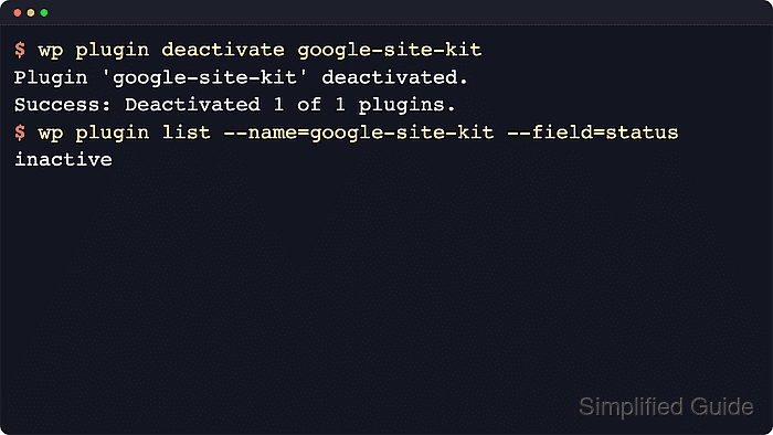 $ wp plugin deactivate google-site-kit Plugin 'google-site-kit' deactivated. Success: Deactivated 1 of 1 plugins.